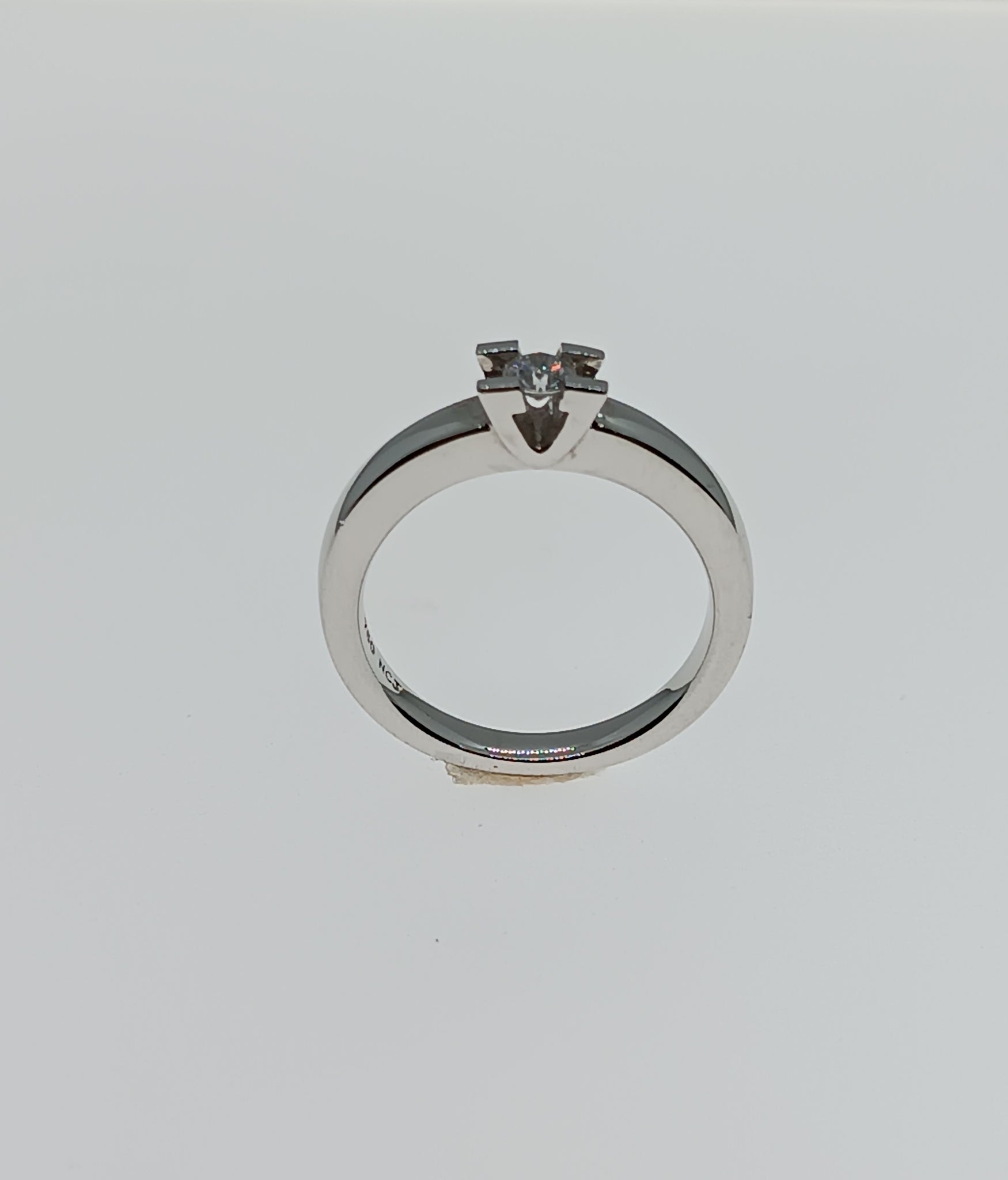 - 📝 DESCRIPCIÓN: Solitario Oro Blanco 18 ktes de líneas puras con Diamante Natural montado en elegante garra en forma de "V", que realza su brillo y lo protege. El brazo sólido y con volumen aporta presencia y un estilo contemporáneo.